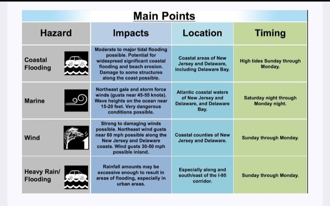 Sunday night–Monday morning: Peak storm intensity with serious possible power outages, flooding, and coastal impacts.