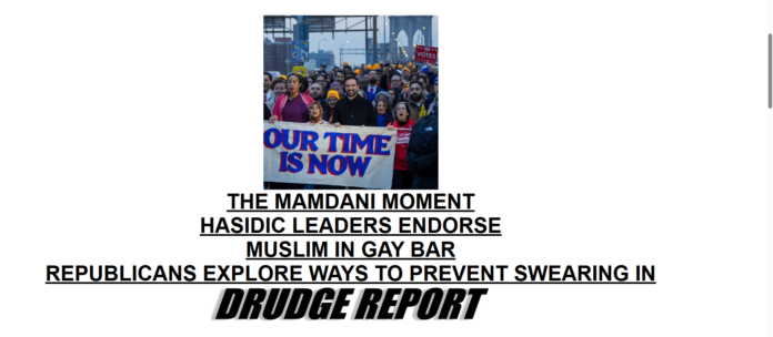 NEW YORK — The Drudge Report, the influential political news aggregator founded by Matt Drudge, ran a prominent Monday headline reporting that Hasidic leaders have endorsed State Assemblyman Zohran Mamdani in the New York City mayoral election.