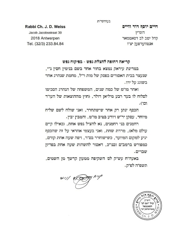 The Haredi community spearheaded the campaign, with rabbis, legal experts, and activists raising $250,000 for a settlement that can commute death sentences. Rabbi Chaim David Yosef Weiss (the Chid”u) of Antwerp traveled to Kurdistan to oversee the agreement with local tribal elders.