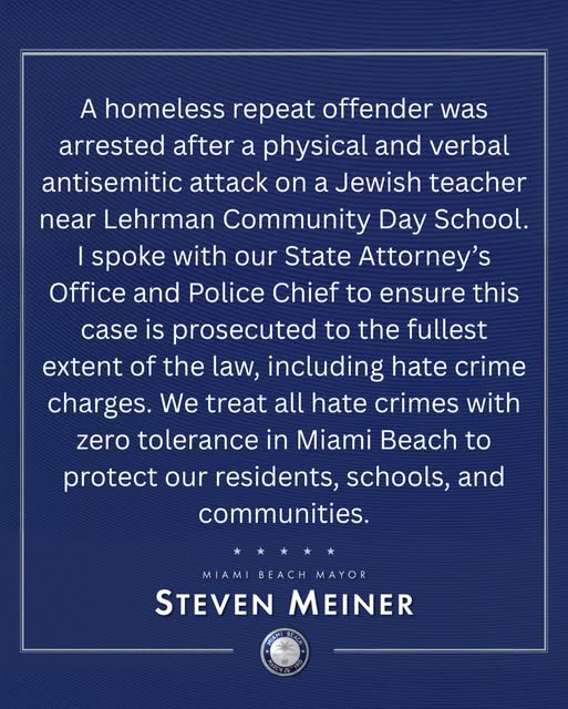 “A homeless repeat offender was arrested after a physical and verbal antisemitic attack on a Jewish teacher near Lehrman Community Day School. I spoke with our State Attorney’s Office and Police Chief to ensure this case is prosecuted to the fullest extent of the law, including hate crime charges. We treat all hate crimes with zero tolerance in Miami Beach to protect our residents, schools, and communities.”