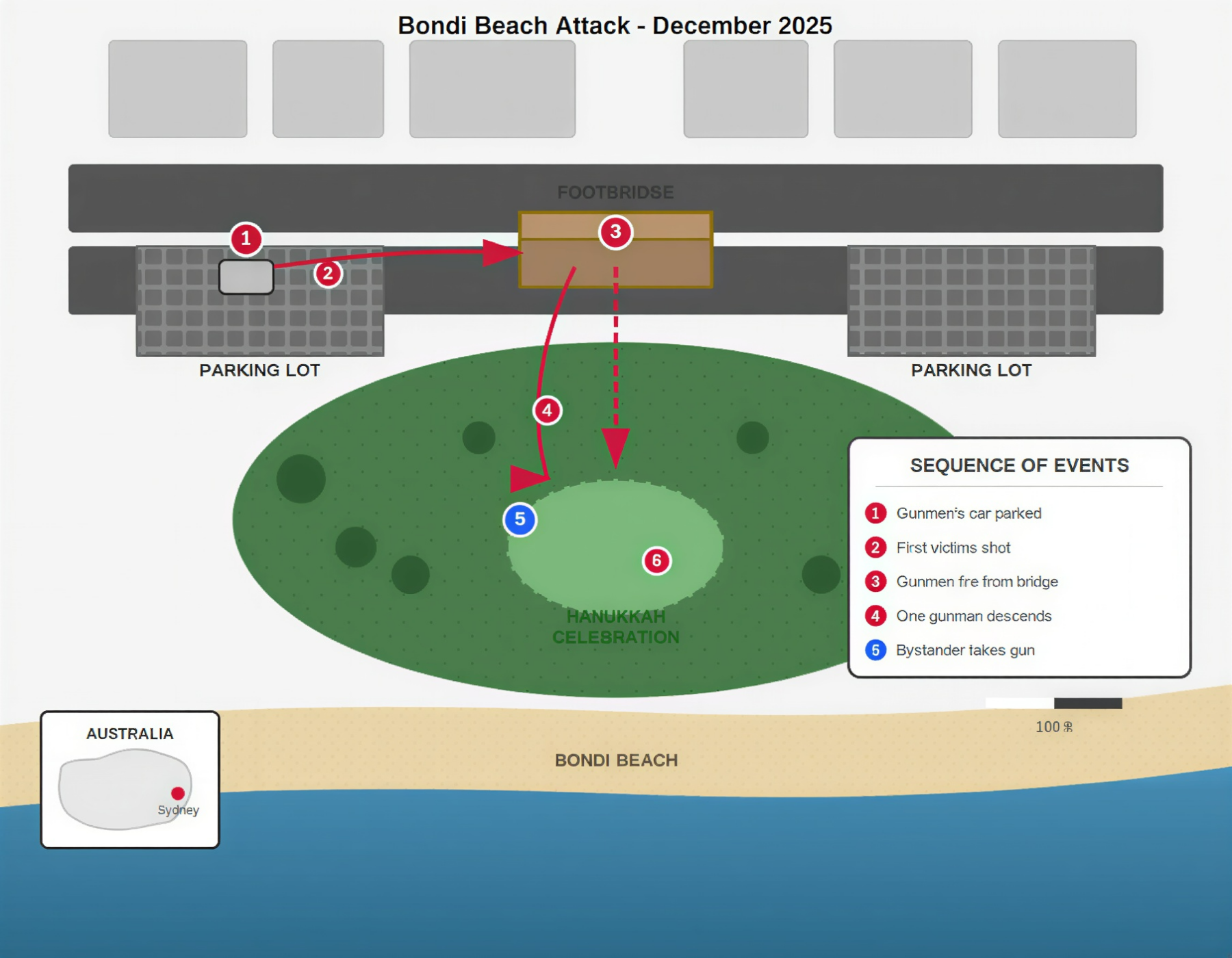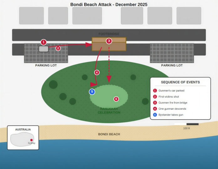 The gunmen then walked up onto the footbridge, carrying three long guns. From this high position, they could see the crowd below in the park. Hundreds of people had gathered on the lawn for a free Hanukkah celebration with donuts and music. The attackers opened fire on the crowd from the bridge.