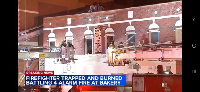 BOROUGH PARK – A four-alarm fire tore through a matzah bakery in Brooklyn’s Borough Park neighborhood early Wednesday, injuring four people, including a firefighter who was briefly trapped after part of the building collapsed, authorities said.