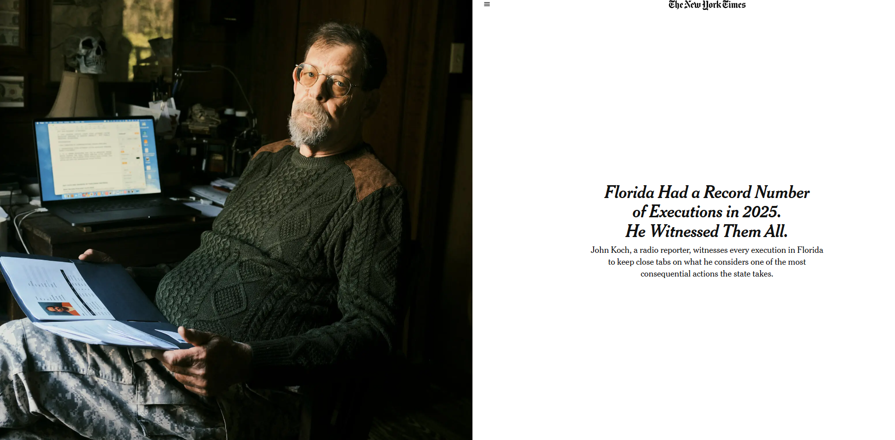 The Times reported that Koch personally opposes the death penalty, calling it outdated, but believes bearing witness is essential as executions accelerate in Florida and beyond.
