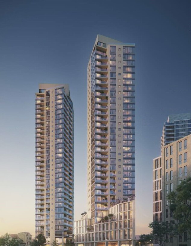 The towers are located in a central urban corridor and were constructed as part of a large-scale redevelopment project.