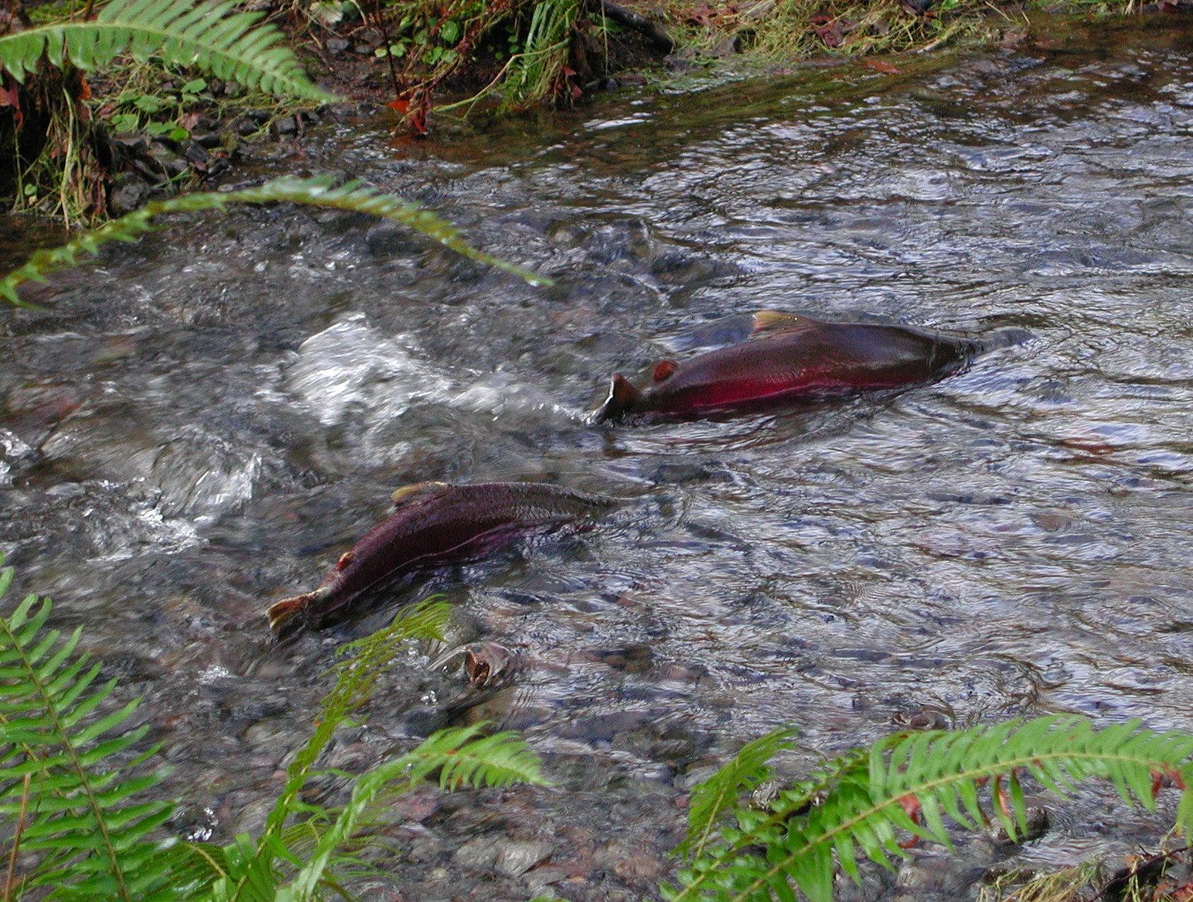 When the salmon returned to the Elwha, they spawned. Spawning means that the female digs a shallow nest in the riverbed gravel and lays her eggs. The male fertilizes them. After this single act of reproduction, Pacific salmon die. They reproduce once, and only once, at the end of their journey.