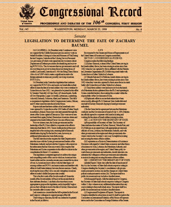Campbell, a Republican and one of the most prominent Native American lawmakers in U.S. history, played a key role in galvanizing American diplomatic pressure over the fate of Israeli soldiers captured during the 1982 Lebanon war. In 1999, he introduced legislation directing the U.S. State Department to press Syria and Palestinian leadership for information about three missing Israeli soldiers, including Zachary Baumel, a Brooklyn-born American citizen who served in the Israel Defense Forces.